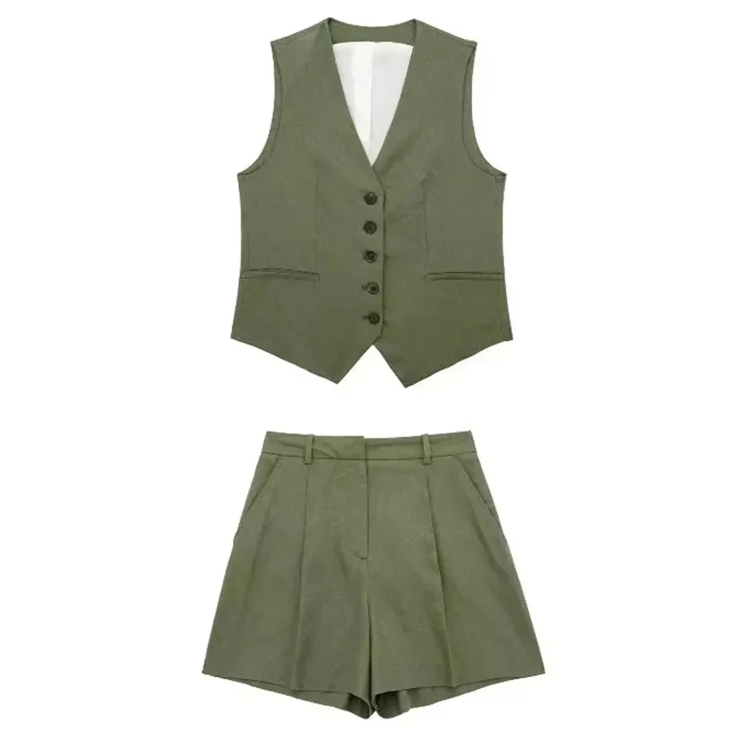 Women’s Linen Vest Shorts Set – V Neck Chic Summer Casual  Office Outfit